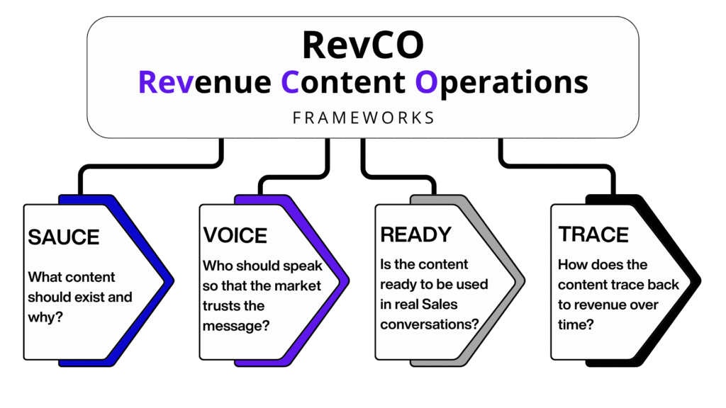 RevCO is Revenue Content Operations, and it is marketing’s revenue operating model for content. It gives marketing strategic clarity through SAUCE, authority structure through VOICE, sales usability standards through READY, and executive expectation alignment through TRACE.
