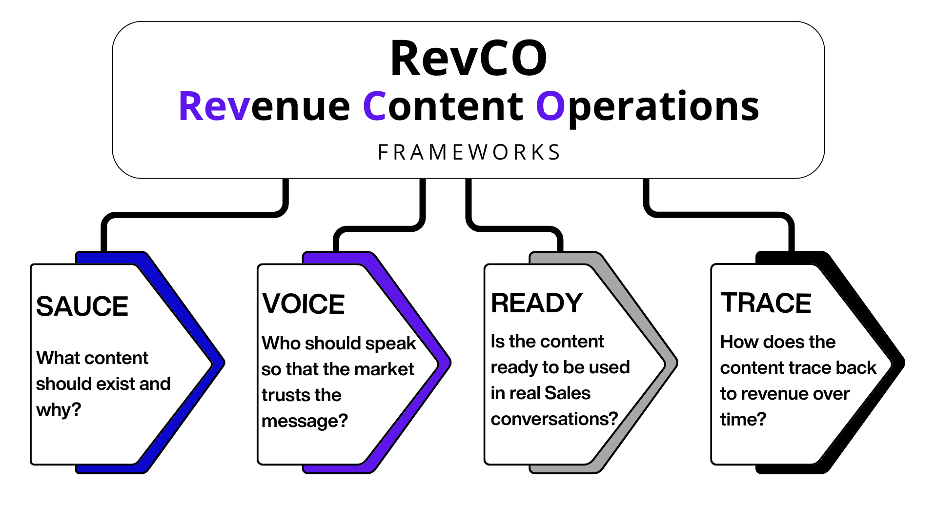 RevCO is Revenue Content Operations, and it is marketing’s revenue operating model for content. It gives marketing strategic clarity through SAUCE, authority structure through VOICE, sales usability standards through READY, and executive expectation alignment through TRACE.
